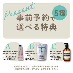 「茅乃舎だし・ロクシタンハンドクリーム・イソップハンドソープ」のいずれかをプレゼント!